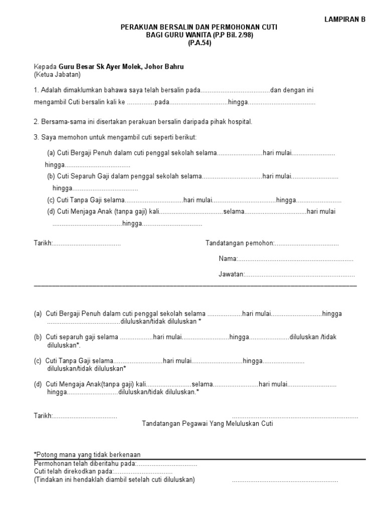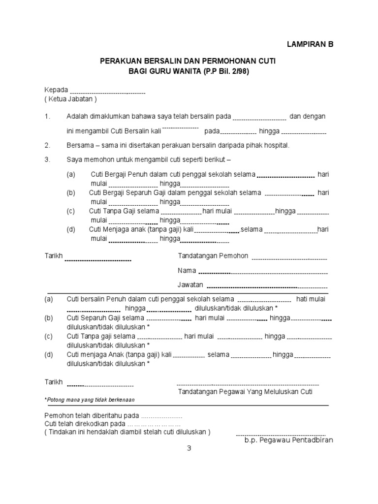 Doc Lampiran B Perakuan Bersalin Dan Permohonan Cuti Bagi Guru Wanita P P Bil 2 98 Doc Uhisyam Sriib Academia Edu