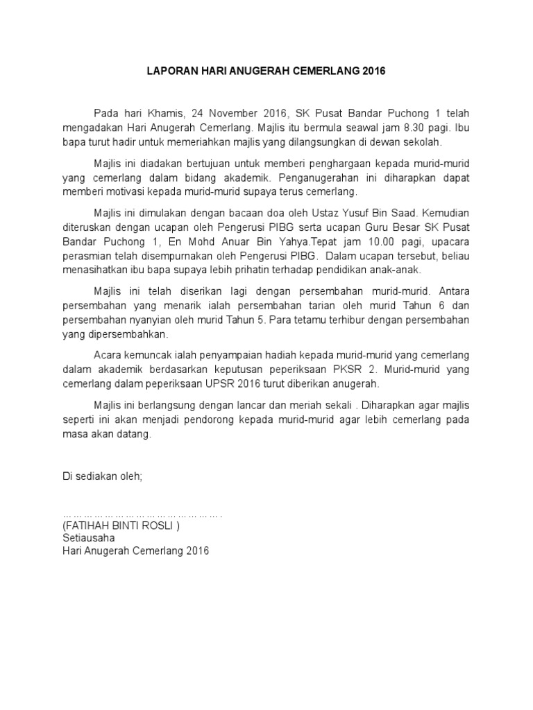 Laporan hari anugerah cemerlang. Date uploaded on thu 17 oct 2019 uploaded by. 5504 hits laporan majlis hari anugerah cemerlang berikut dikongsikan contoh laporan hari anugerah cemerlang buat panduan diantara isi kandungan laporan yang perlu ada adalah nama sekolah tujuan diadakan kronologi acara dan penyedia laporan contoh lap. Laporan hari anugerah kecemerlangan sekolah. Teks pengacaraan hari anugerah cemerlang.