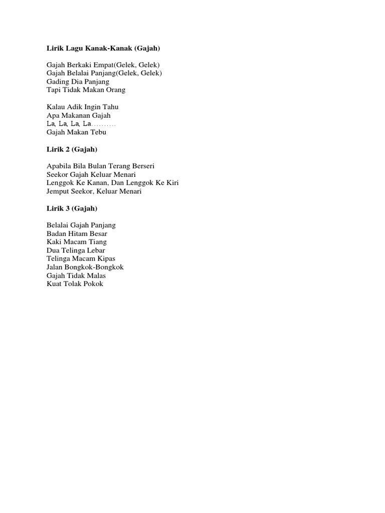Lirik lagu kanak kanak melayu. Ikan kekek mak iloi iloi ikan gelama mak ilai ilai nanti adik mak iloi iloi pulang bersama mak ilai ilai tenang tenang air dilaut sampan golek mudik ke tanju. Lagu kanak kanak alif mimi 1 2 3 sayang semuanya subscribe. 15 lagu anak anak dalam bahasa inggris liriknya. Ketam jalan senget senget itik jalan baris baris katak jalan lompat lompat kuda berlari lari.