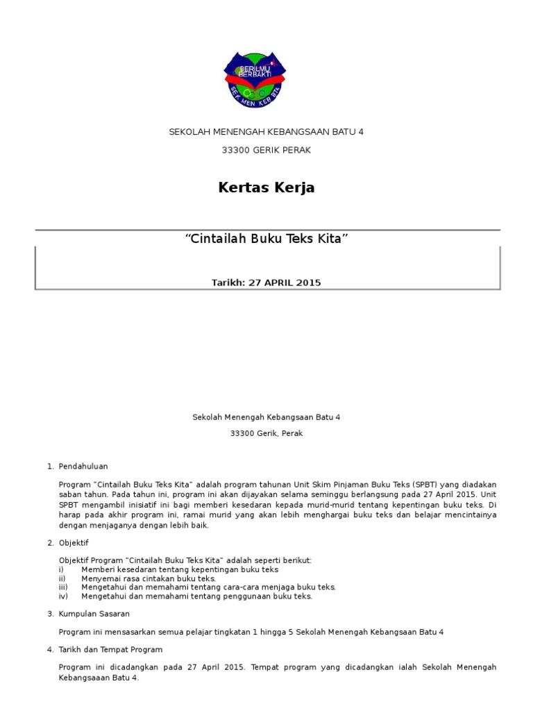 Menengah Contoh Kertas Kerja Program Sekolah