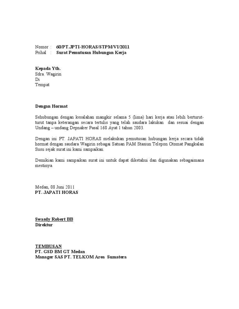 Contoh Surat Pemecatan Karyawan Secara Hormat Kumpulan Surat Penting