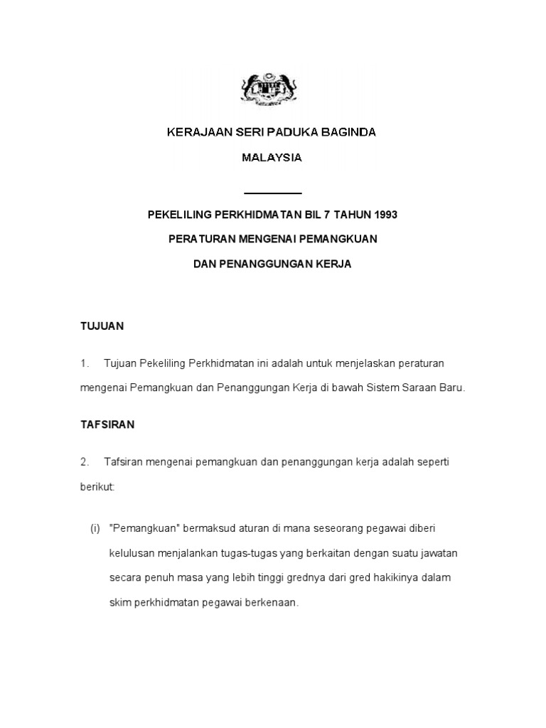Pekeliling Perkhidmatan Bil 7 Tahun 1993 Peraturan Mengenai Pemangkuan Dan Penanggungan Kerja