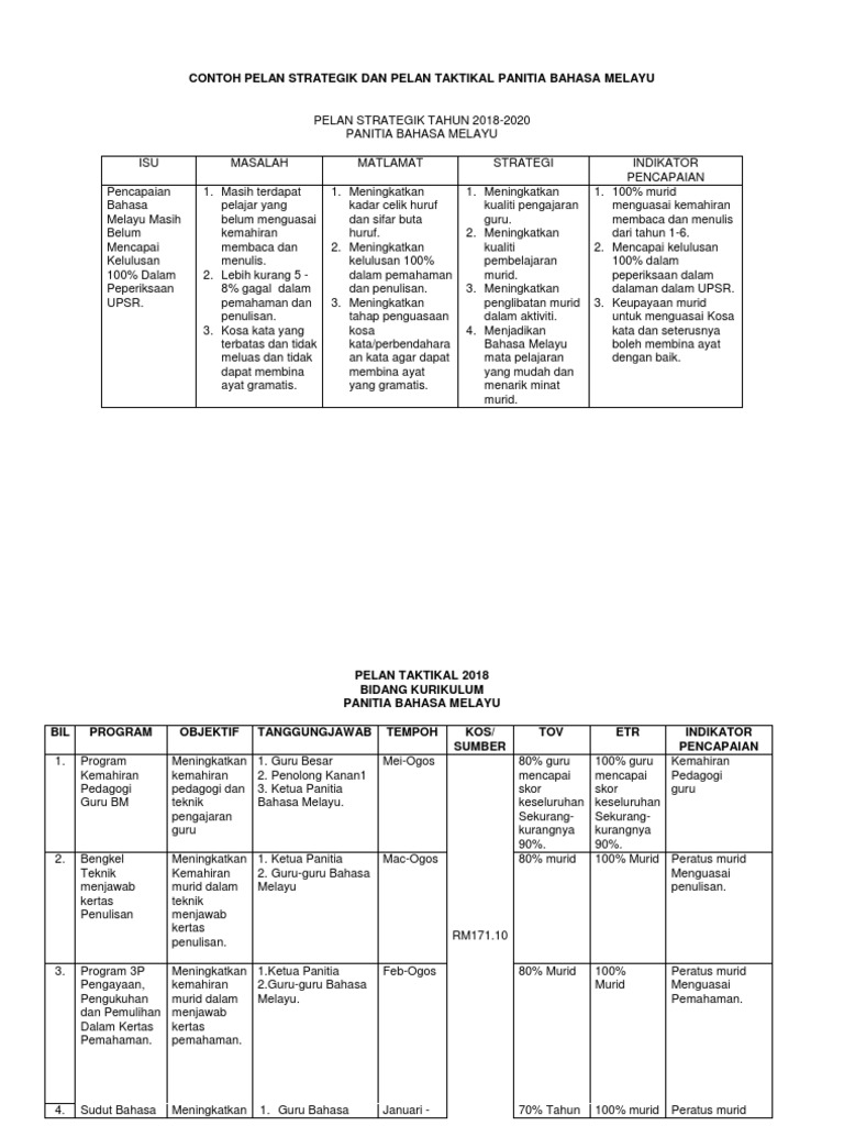 Doc Contoh Pelan Strategik Dan Pelan Taktikal Panitia Bahasa Melayu Sk Sulaiman Academia Edu