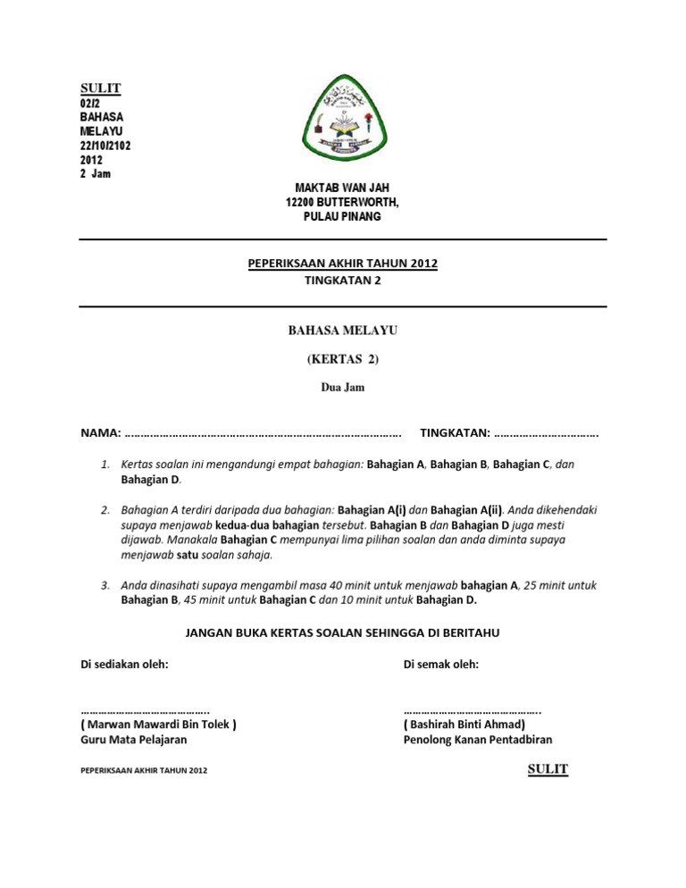 Front Cover Page Exam Paper English P1 Form 4