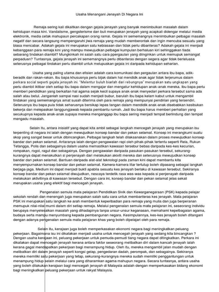 Bagus karangan yang mantap doakan saya dan kawan saya hanis sofea berjaya mendapat straight a pt3 2016. Pendek kata peranan kempen turut dapat mengurangkan peratusan kes jenayah di nusa tercinta ini. Hal ini amat penting bagi mendidik anak anak mereka dari kecil supaya dapat membezakan antara kebaikkan dan keburukkan dalam melakukan sesuatu tindakan. Konklusinya kegiatan jenayah dalam kalangan remaja mendatangkan impak negatif kepada diri masyarakat dan negara malah turut menjadi virus epidemik yang akan menjatuhkan imej negara di mata seantero dunia.