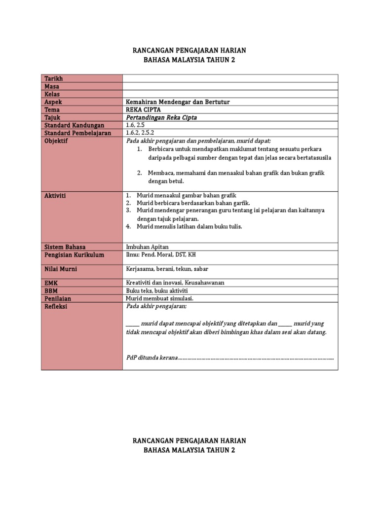 Rancangan Pengajaran Harian Bahasa Malaysia Tahun 2