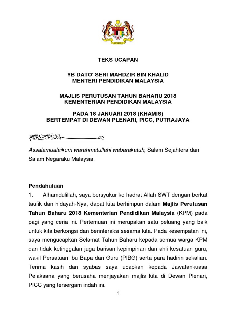 My E Koko Perutusan Tahun Baru 2018 Menteri Pendidikan