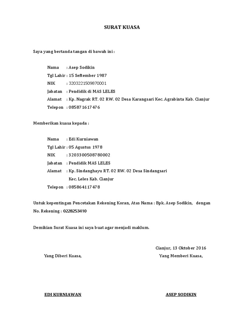 Perwakilan Rekening Bank Perwakilan Contoh Surat Kuasa