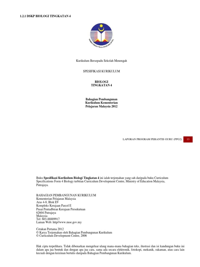 1 2 1 Dskp Biologi Tingkatan 4 Kurikulum Bersepadu Sekolah Menengah