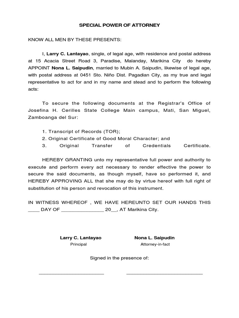 Sample Special Power Of Attorney